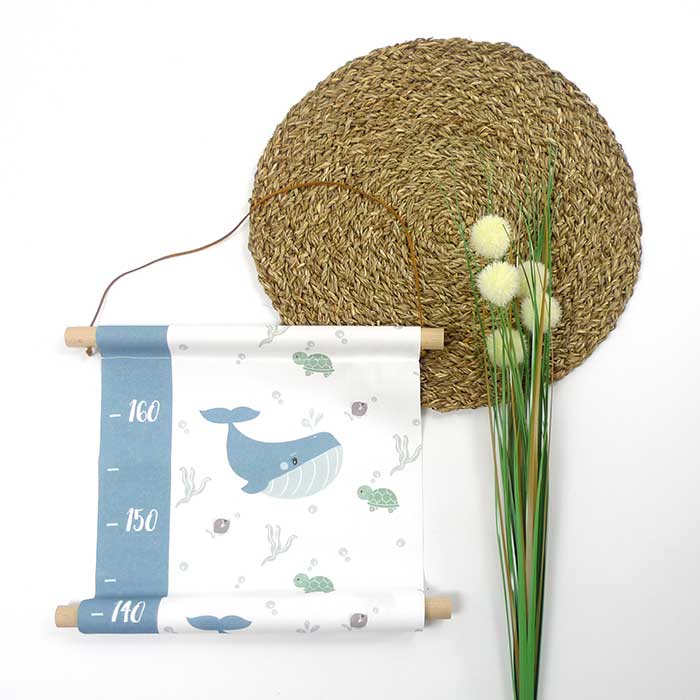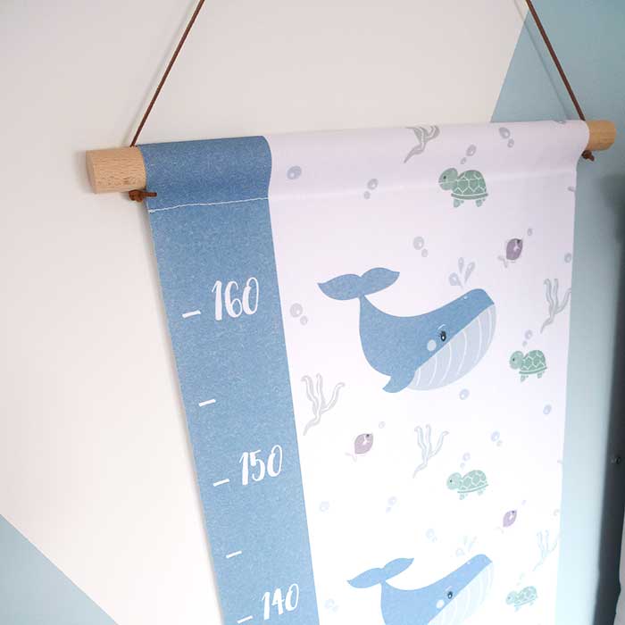 Deze vrolijke groeimeter is gemaakt van een luxe kreukvrije polyester met beukenhouten stokjes. De lederen veter voor het ophangsysteem is gemakkelijk te verstellen zodat je zelf de lengte kunt bepalen. De zijkanten zijn lasergesneden voor een strakke afwerking en om rafelen te voorkomen.