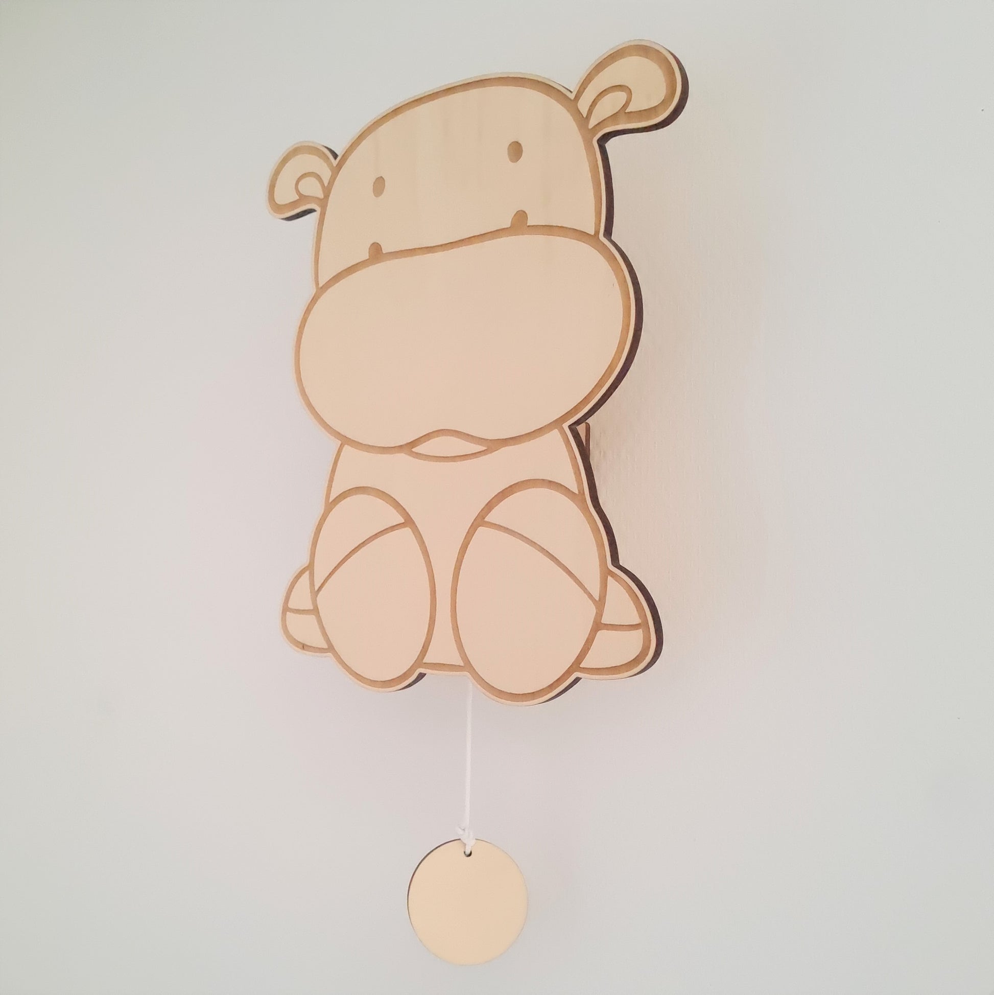 Een prachtig handgemaakt muziekdoosje in de vorm van een nijlpaard. Hang de nijlpaard aan de muur, trek aan het koord en het nijlpaard laat een rustgevend melodietje horen waarbij het kindje heerlijk in slaap kan vallen. De nijlpaard is gemaakt van onbewerkt berken multiplex de je eenvoudig kunt ophangen aan een schroef of haakje.