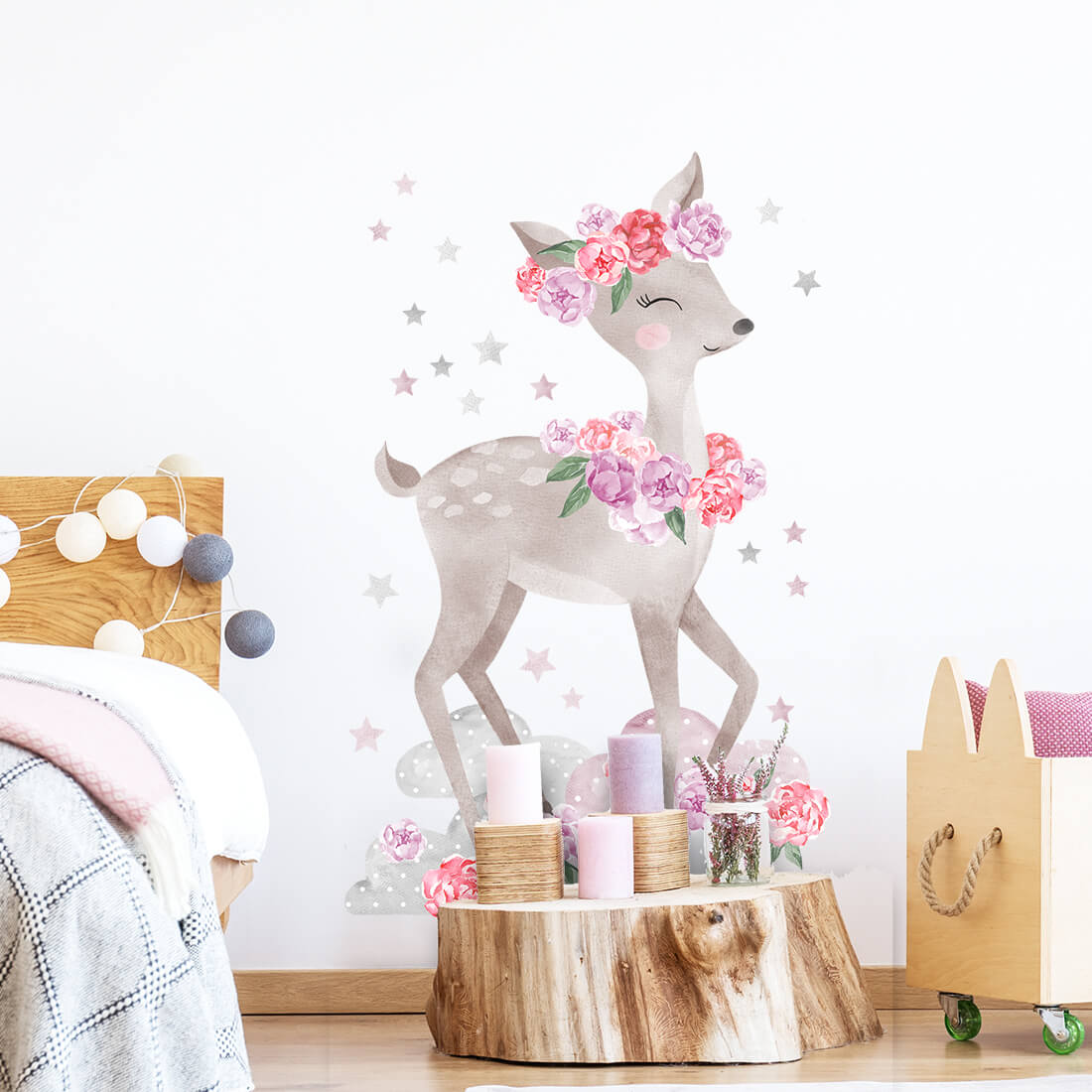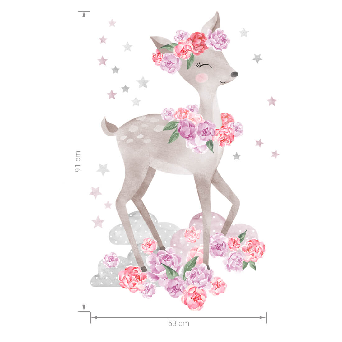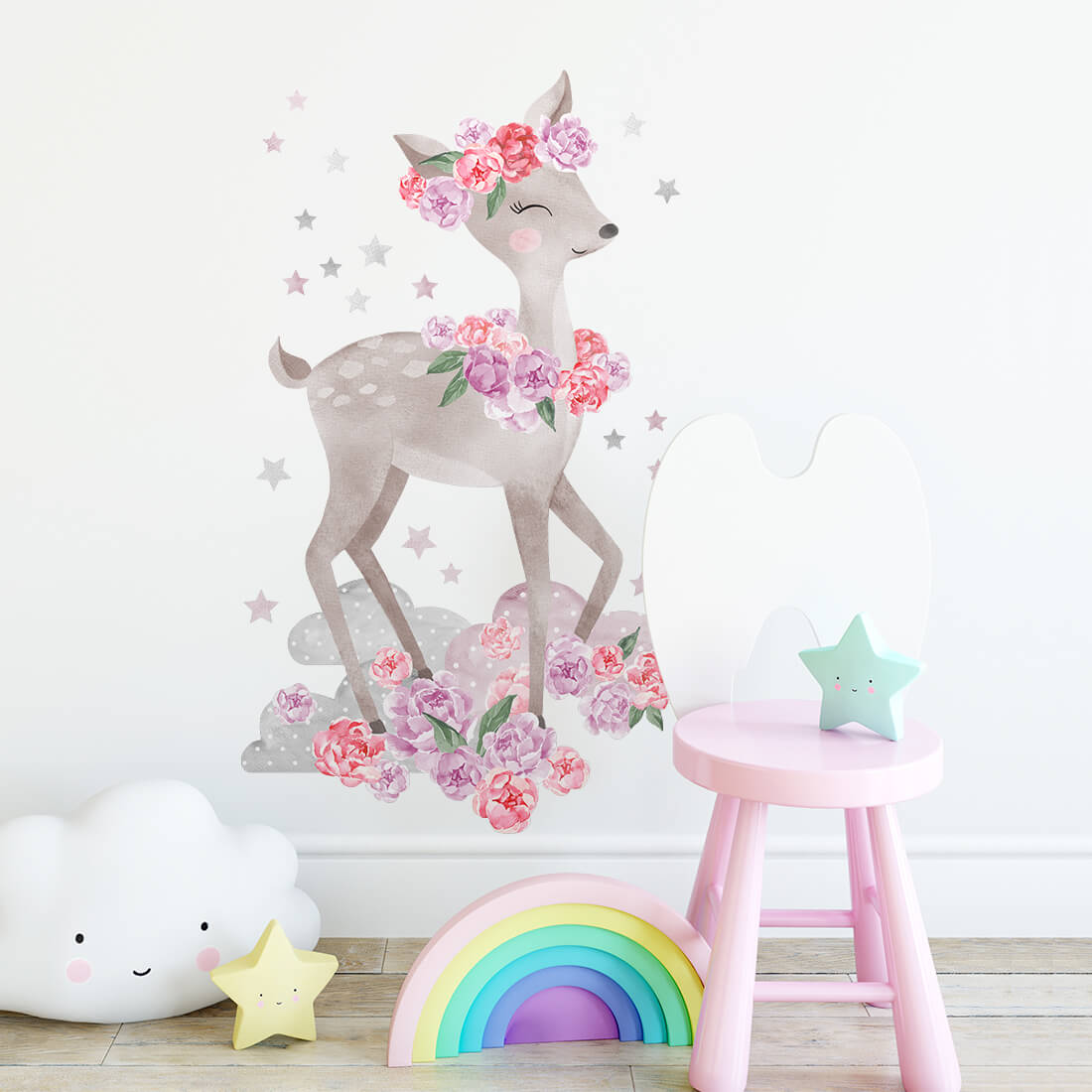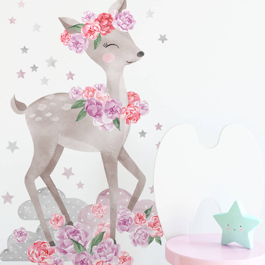 De roze hertsticker maakt deel uit van de pioenrozencollectie die is gemaakt voor alle fans van bloemmotieven en bosdieren.