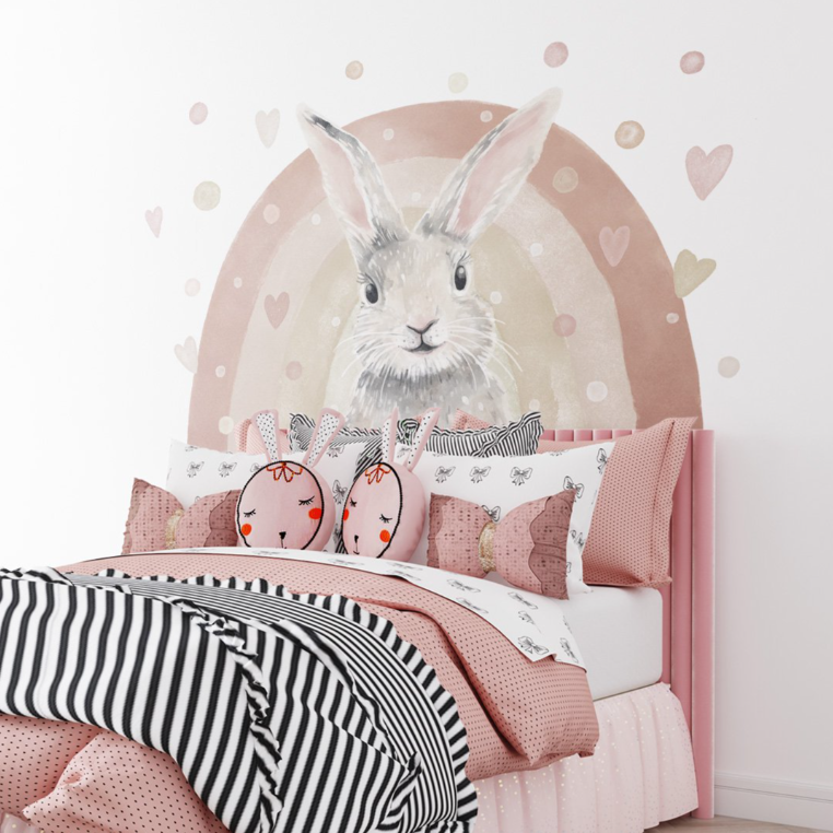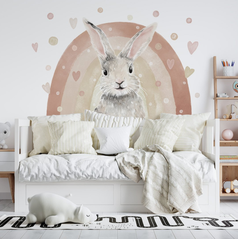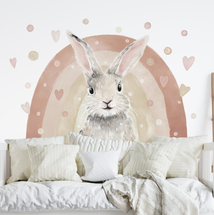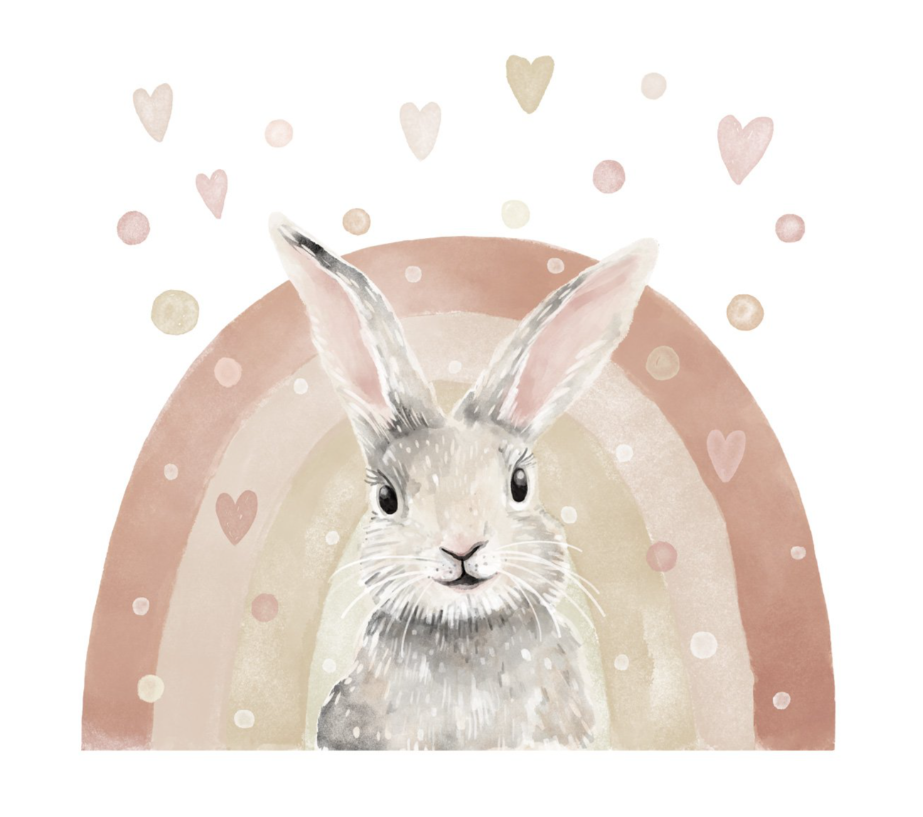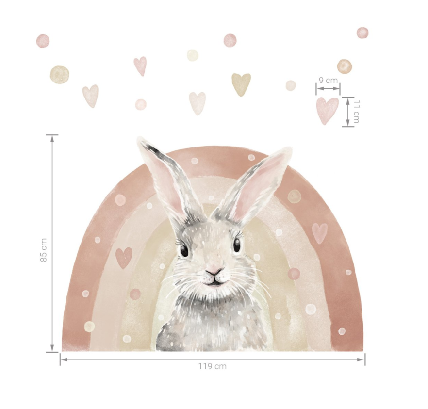 De muurstickers uit de regenboogcollectie zitten vol met met details en een harmonie van kleuren, waarvan het palet is aangepast aan de nieuwste interieurtrends. Hierdoor passen ze perfect in elke babykamer en kinderkamer. Deze konijnensticker is een eenvoudige en snelle manier om een prachtige metamorfose van de slaap of speelkamer te creëren.