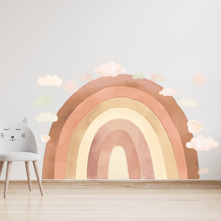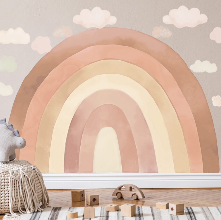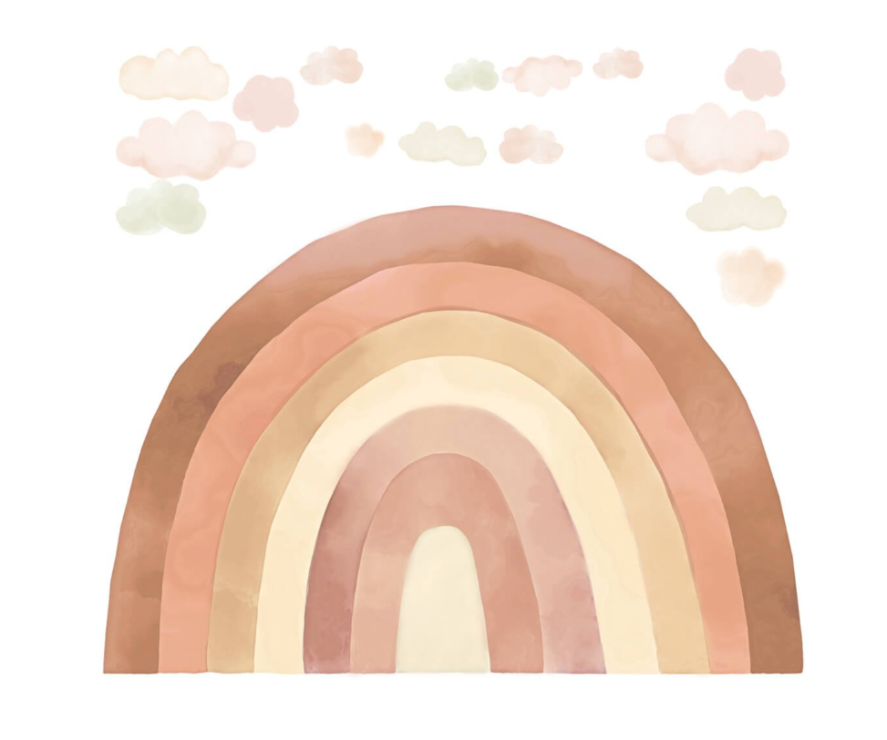 Deze aquarel regenboog zal er fantastisch uitzien in elke kinderkamer. Fijne lichte kleuren geven de muur een bijzonder karakter.